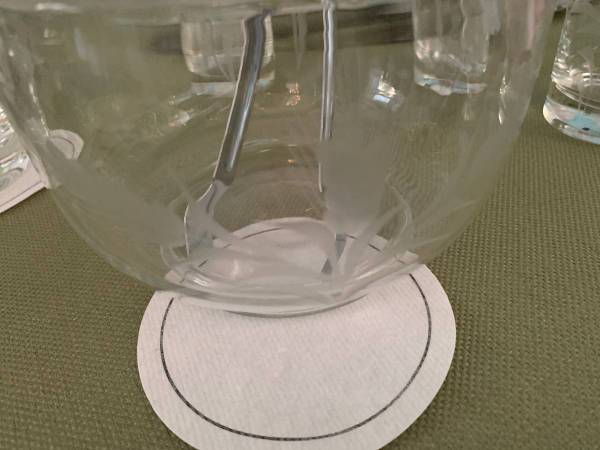 Beautiful Fun Vintage Wheat Motif Etched Glass Set 4 Wheat Etched glasses 5” One Wheat Etched Ice Bowl with Tongs Etched Tin silver tray Delivery to New Haven area for small fee!