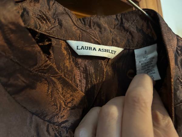 Laura Ashley pantsuit velvety brown color, includes pants with elastic waistband size small, tank top size medium and decorative jacket size small.