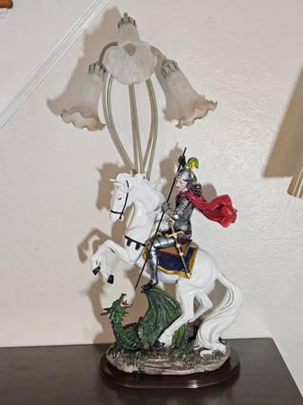 Large vintage Tiffany Style table lamp with resin statue of Saint George is depicted as the consummate knight on a white stallion horse clad in gleaming plate armor as he slays the dragon, a symbol of evil on a wood base. Legends like those of Saint George held special appeal in representing the triumph of good over evil. Lamp features sage green stems with speckled pink tulip shaped angel trumpet lily glass shades atop the sculpture. Lamp measures approximately 35 inches tall. Can deliver in the New Haven area for an additional $5