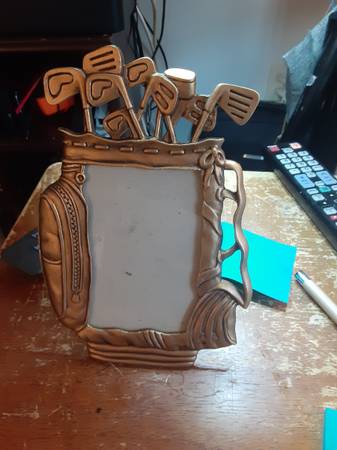 Sage Pewter golf bag, and golf clubs picture frame. Holds photo size 3.5×5" preowned in great condition.