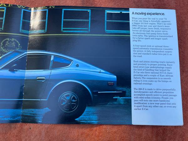 I have this 1974 260 Z factory sales brochure $25 and this metal fair Lady Z front vanity plate looks to painted aluminum. $20. Can be mailed to you in the USA. Thank you.