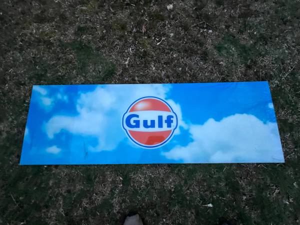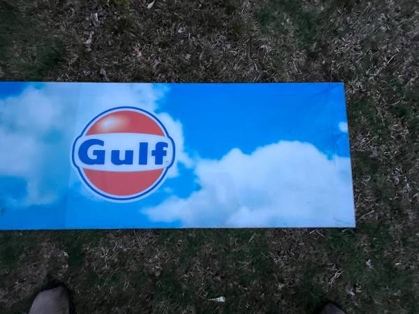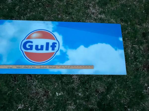 IF You see this it is available. Private message with a sentence and phone contact to be responded to. As pictured these 2 Nice plastic plexi glass GULF Gas Station Signs