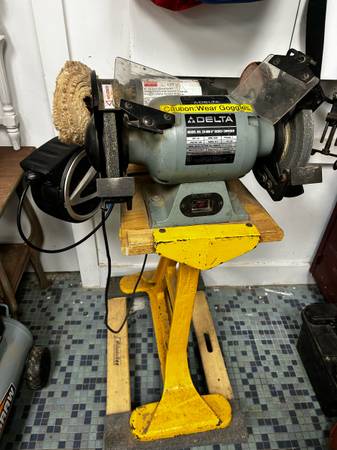 Cast iron stand. Delta 8” bench grinder Great shape. Dayton variable speed buffer for finishing up projects.