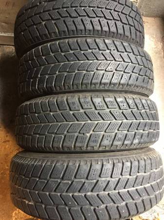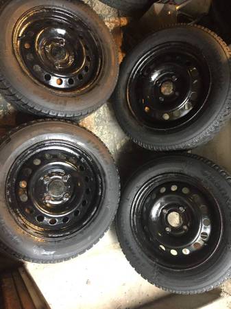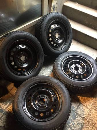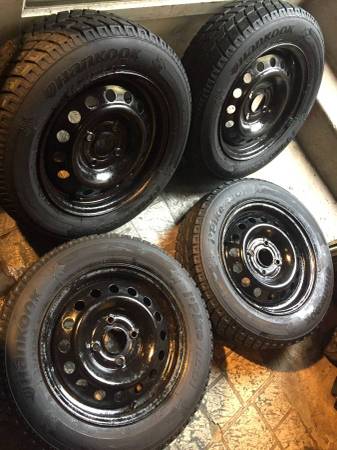 (4) 195-65-15 Hankook ipike rc01 snow tires with deep tred left, like new (4) 15'' 4x114.3 rusty steel wheels off a 99 accord (wheels have a new coat of black paint over rust and look ok, but they...